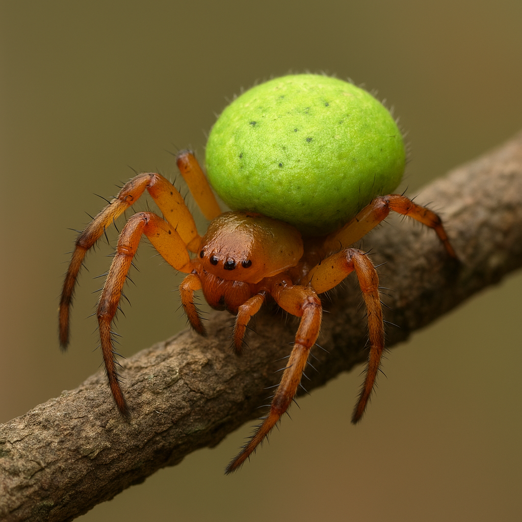 - Jaskrawe zielone ubarwienie nie jest przypadkowe — to skuteczny kamuflaż na liściach, chroniący pająka przed drapieżnikami.