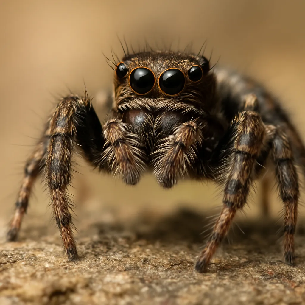 • Oczy: cztery pary, z bardzo widocznymi oczami przednimi; ułatwiają zwód i precyzyjne skoki.